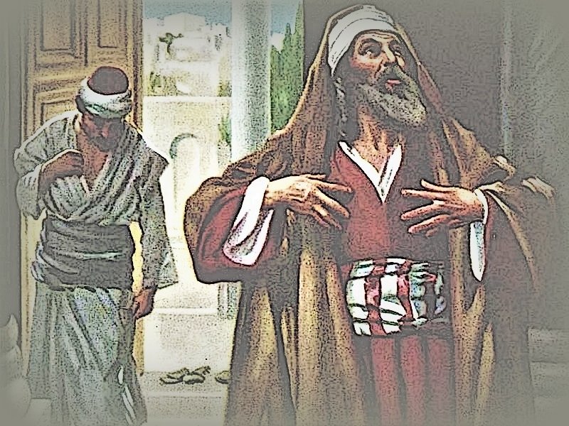 Dwóch ludzi przyszło do świątyni, żeby się modlić, jeden faryzeusz, a drugi celnik. Faryzeusz stanął i tak w duszy się modlił: „Boże, dziękuję Ci, że nie jestem jak inni ludzie: zdziercy, niesprawiedliwi, cudzołożnicy, albo jak i ten celnik. Zachowuję post dwa razy w tygodniu, daję dziesięcinę ze wszystkiego, co nabywam”.
